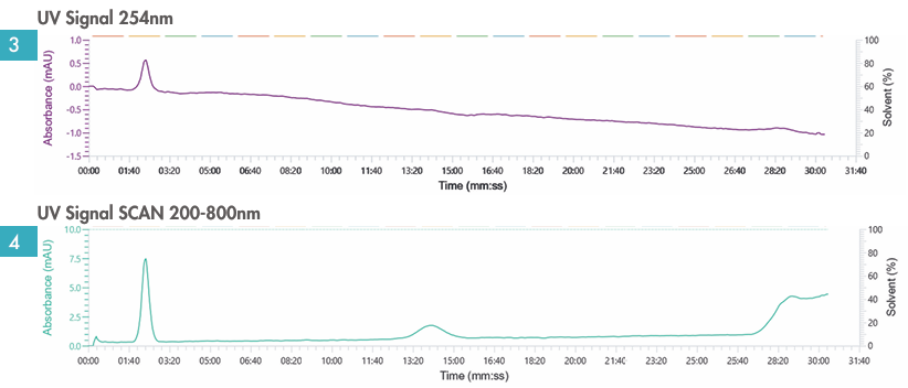 图3与图4:紫外检测下化合物不可见。。。。。检测初期首波化合物最先展现低强度信号,,,,,,,但强度缺乏以实现有用网络